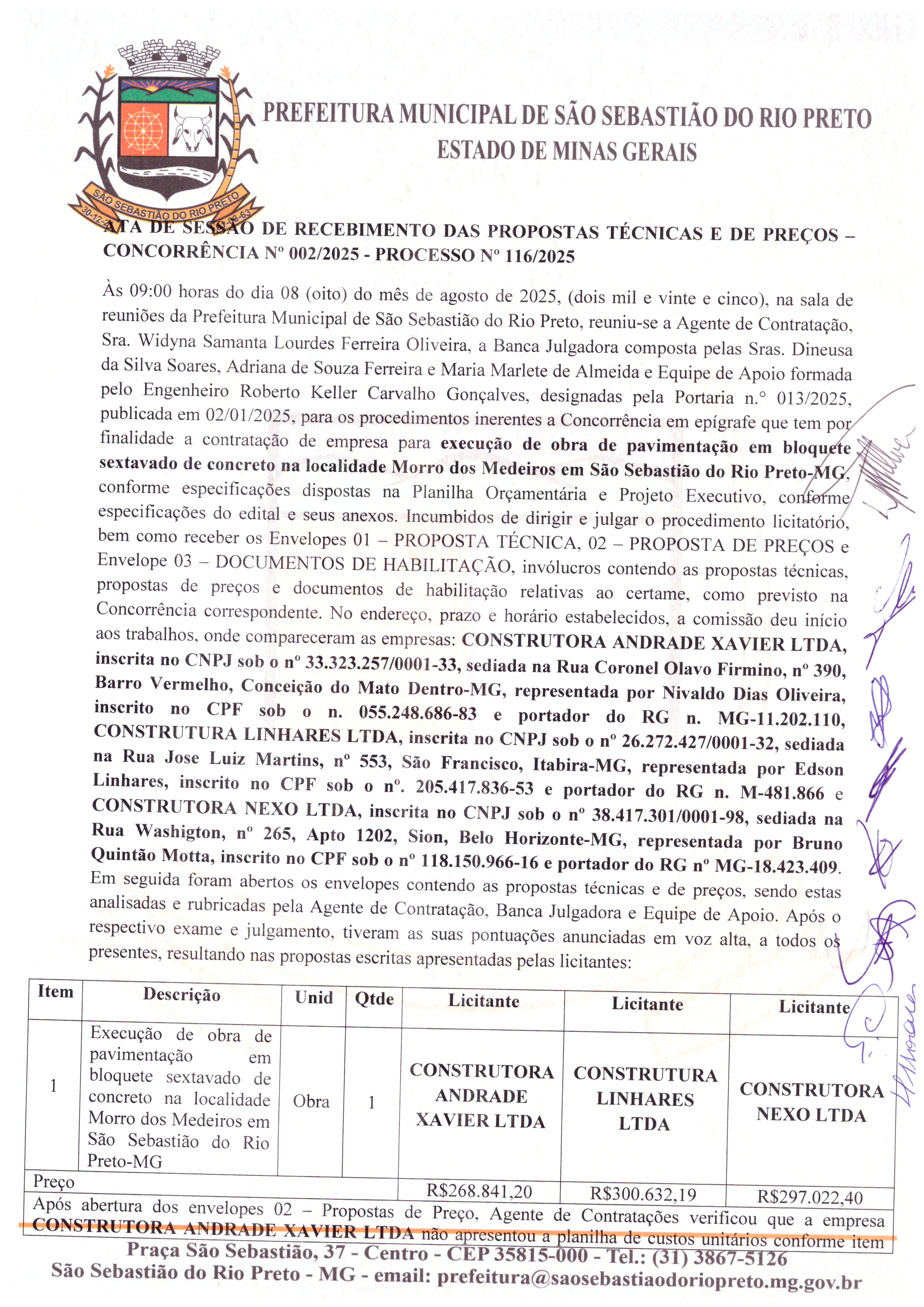 Concorrência Nº 02/2025 Situação: Homologada Data abertura: 18/06/2025 Objeto: Contratação De Empresa Para Execução De Obra De Pavimentação Em Bloco Sextavado De Concreto Na Localidade Morro dos Medeiros, em São Sebastião Do Rio Preto- MG Tipo: Melhor técnica e preço Processo licitatório: 116/2025 DOCUMENTOS Concorrência 02 processo 116 2025 Calçamento Morro Medeiros.pdfConcorrência 02 processo 116 2025 Calçamento Morro Medeiros.pdf Cotrato 158 assinado.pdfCotrato 158 assinado.pdf